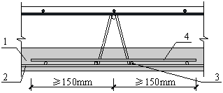 1—支承梁或墙;2—桁架预制板;3—桁架预制板纵筋;4—钢筋桁架;5—支座处桁架预制板纵筋搭接钢筋;6—横向分布钢筋(三)创新提出钢筋桁架兼作吊点的设计方法和构造措施钢筋桁架兼作吊点可避免另外设置专门吊点,减少生产工序,节约成本。为确保钢筋桁架吊点的安全性和可靠性,对钢筋桁架吊点提出了具体的构造要求,如图3所示,钢筋桁架埋深不小于35mm;当钢筋桁架下弦钢筋位于板内纵向钢筋上方时,应在吊点位置钢筋架下弦钢筋上方设置至少2根附加钢筋,附加钢筋直径不宜小于8mm,在吊点两侧的长度不宜小于150mm。给出吊索与桁架预制板水平夹角不小于60°、预制板混凝土立方体抗压强度不低于20MPa前提下的吊点承载力标准值,并提出了施工安全系数的取值要求。