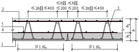 钢筋桁架混凝土叠合板是当前应用中最常用的叠合板形式,钢筋桁架叠合板连接方式的创新是当前的重要任务。国家现行标准《混凝土结构设计规范》GB 50010、《装配式混凝土建筑技术标准》GB/T 51231、《装配式混凝土结构技术规程》JGJ 1等对于混凝土叠合板、钢筋桁架混凝土叠合板和钢筋桁架预制板,均有相应规定。《钢筋桁架混凝土叠合板应用技术规程》T/CECS 715-2020(以下简称《规程》)在这些标准的基础上,通过进一步的研究和实践,对现有标准中的相应规定做了改进和完善,全面、系统地总结钢筋桁架叠合板的设计、制作、施工及验收,使该项技术更好地服务于实际工程。《规程》由龙信建设集团有限公司、建研科技股份有限公司主编。其内容共分7章、2个附录。主要技术内容是:总则,术语和符号,材料,钢筋桁架,结构设计,桁架预制板制作、运输与堆放,施工与验收以及有关附录。实际工程中,混凝土叠合板多采用双向板设计,为解决双向板板侧出筋问题,提出了密拼式整体接缝构造及其设计方法,确定了密拼式整体接缝的传力机理。具体构造措施如图1所示,密拼式整体接缝紧贴叠合面设置垂直于密拼接缝的搭接钢筋,搭接钢筋与桁架预制底板纵向钢筋对应布置,两者通过间接搭接传力,搭接钢筋直径不小于8mm且不大于14mm,搭接长度不小于1.6la,la为受拉钢筋锚固长度。为保证间接搭接传力性能,在拼缝一侧搭接范围内设置垂直于搭接钢筋的横向分布钢筋,并要求横向分布钢筋数量不少于2根,直径不小于6mm,间距不大于250mm;利用板边2道钢筋桁架腹杆筋作为厚度方向的横向钢筋,并要求桁架上弦筋不大于叠合板厚的2倍且不大于400mm,靠近拼缝的桁架上弦筋到桁架预制板边的距离不大于叠合板厚度且不大于200mm。