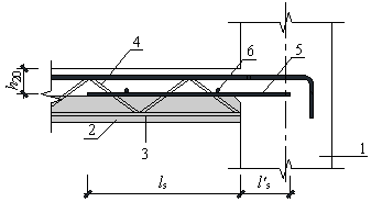 为解决预制底板端部出筋问题,提出了板端支座不出筋节点构造,如图2所示,在支座处设置垂直于板端的预制板纵筋搭接钢筋,搭接钢筋面积不小于同方向受力钢筋面积的1/3,直径不小于8mm,间距不大于250mm,搭接钢筋伸入叠合板后浇层锚固长度ls不小于1.2la,伸入支承梁或墙的锚固长度l’s不小于15d(板端承担负弯矩)或la(板端承担正弯矩)。