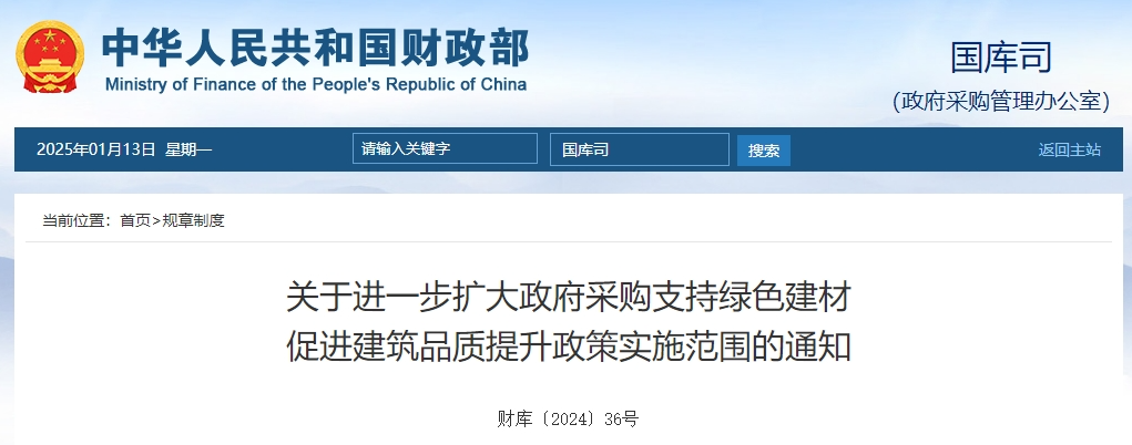 各省、自治区、直辖市、计划单列市财政厅(局)、住房城乡建设厅(委、管委、局)、工业和信息化主管部门,新疆生产建设兵团财政局、住房城乡建设局、工业和信息化局: 为深入贯彻落实党的二十届三中全会精神,按照国务院办公厅《政府采购领域“整顿市场秩序、建设法规体系、促进产业发展”三年行动方案(2024—2026年)》(国办发〔2024〕33号)完善政府绿色采购政策有关部署,积极推广绿色建筑和绿色建材,在前期政府采购支持绿色建材促进建筑品质提升政策实施基础上,财政部、住房城乡建设部、工业和信息化部决定进一步扩大政策实施范围。现将有关事项通知如下: 自2025年1月1日起,在北京市朝阳区等101个市(市辖区)实施政府采购支持绿色建材促进建筑品质提升政策(具体城市名单见附件1)。纳入政策实施范围的项目包括医院、学校、办公楼、综合体、展览馆、会展中心、体育馆、保障性住房以及旧城改造项目等政府采购工程项目,含适用招标投标法的政府采购工程项目。鼓励各政策实施城市将其他政府投资项目纳入实施范围。 各政策实施城市要深入贯彻习近平生态文明思想,以推动城乡建设绿色发展为目标,运用政府采购政策积极推广应用绿色建筑和绿色建材,大力发展装配式、智能化等新型建筑工业化建造方式,建设绿色建筑,形成支持建筑领域绿色低碳转型的长效机制,引领建材和建筑产业高质量发展,着力建设安全、舒适、绿色、智慧的好房子,打造宜居、绿色、低碳城市。 (一)落实政府采购政策要求。各政策实施城市要严格执行《绿色建筑和绿色建材政府采购需求标准(2025年版)》(以下简称《需求标准》,见附件2),按照《财政部办公厅 住房城乡建设部办公厅 工业和信息化部办公厅关于印发<政府采购支持绿色建材促进建筑品质提升政策项目实施指南>的通知》(财办库〔2023〕52号)要求,在纳入政策实施范围项目的可研编制、设计与审查、政府采购、施工、检测、验收、第三方机构(预)评价全流程的相关活动中,落实政府采购支持绿色建材促进建筑品质提升政策。鼓励通过验收的项目申报绿色建筑标识,充分发挥政府采购工程项目的示范作用。 (二)加强绿色建材采购管理。政府采购工程项目使用的建材属于《需求标准》明确为“必选类”的,应当全部采购和使用符合相关标准的绿色建材;属于《需求标准》明确为“可选类”的,政策实施城市可结合自身区域位置、产业发展等实际情况,自主选择使用性价比高的绿色建材产品,选用种类应不低于建筑项目所涉及的建材种类的40%。各政策实施城市要探索实施对通用类绿色建材的批量集中采购,由政府集中采购机构或部门集中采购机构定期归集采购人的绿色建材采购计划,开展集中带量采购。要积极推进绿色建材电子化采购交易,逐步将所有符合条件的绿色建材产品纳入电子平台交易,提高绿色建材采购效率和透明度。绿色建材供应商在供货时应当出具所提供建材产品符合需求标准的证明性文件,包括国家统一推行的绿色建材产品认证证书,或符合需求标准的有效检测报告等。 (三)优先开展工程价款结算。纳入政策实施范围的工程项目,要提高工程价款结算比例,工程进度款支付比例不低于已完工程价款的80%。推行施工过程结算,发承包双方通过合同约定,将施工过程按时间或进度节点划分施工周期,对周期内已完成且无争议的工程项目进行价款计算、确认和支付。经双方确认的过程结算文件作为竣工结算文件的组成部分,竣工后原则上不再重复审核。 (一)明确部门职责。政策实施城市财政、住房城乡建设、工业和信息化部门要各司其职,加强协调配合,形成政策合力。财政部门要组织采购人落实《需求标准》,指导集中采购机构开展绿色建材批量集中采购工作,加强对采购活动的监督管理。住房城乡建设部门要加强对纳入政策实施范围的工程项目的监管,培育绿色建材应用示范工程和高品质绿色建筑项目。工业和信息化部门要结合区域特点,因地制宜发展绿色建材产业,培育绿色建材骨干企业和重点产品。 (二)精心组织实施。省级财政、住房城乡建设、工业和信息化部门收到本通知后要及时转发至纳入政策实施范围城市的财政、住房城乡建设、工业和信息化部门,切实加强工作指导。政策实施城市要根据政策要求,研究制定本地区实施方案,明确各有关部门的责任分工,完善组织协调机制,积极总结工作经验,提炼可复制、可推广的先进经验和典型做法,对实践中出现的问题要及时研究和妥善处理,确保扩大实施范围工作顺利推进,取得扎实成效。 (三)强化政策落实。财政部会同住房城乡建设部、工业和信息化部进一步加强政策指导,对部分城市先进经验和典型做法予以宣传推广。省级财政部门会同住房城乡建设、工业和信息化部门要结合本地区实际,探索建立激励评估机制,确保政策落地见效。各有关地区和部门要加强政策解读和宣传培训,及时回应社会关切,调动相关各方的积极性,营造良好的工作氛围。 附件:1.政府采购支持绿色建材促进建筑品质提升政策实施城市名单 2.绿色建筑和绿色建材政府采购需求标准(2025年版)