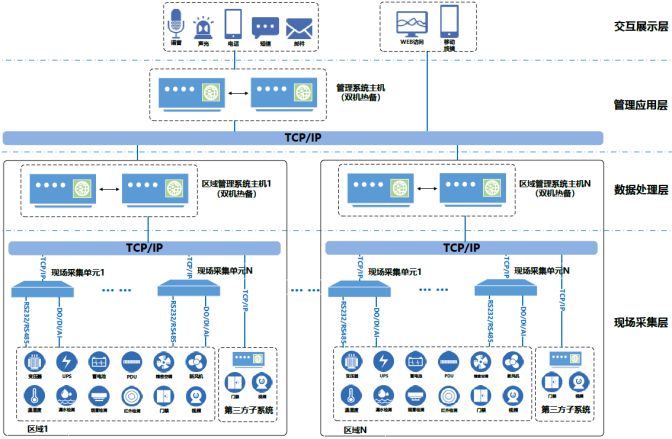 《标准》归纳总结了数据中心行业的实践经验,以现行有效的法律法规为基础,注重可操作性和可实施性,为数据中心监控与管理提供实用方法,并对数据中心落实节能减碳措施提出了具体要求。《标准》在全国众多数据中心实际项目中获得了广泛应用,以深圳市共济科技股份有限公司承建的中国联通福建产业互联网科技园数据中心DCIM系统项目为例,详细分析应用情况。中国联通福建产业互联网科技园数据中心DCIM系统采用《标准》设计和验收。按照《标准》要求,DCIM系统将柴发、变压器、UPS、电量仪、列头柜、PDU、冷水机组,冷冻泵、冷却泵、冷却塔、蓄冷罐、末端精密空调、数据中心温湿度、漏水、门禁、视频、消防等接入同一平台DCIM进行统一运维管理,并配置告警管理、容量管理、能效管理、巡检管理、维保管理、访客管理、报表管理、权限管理、日志管理、系统管理等功能模块,同时预留了资产管理功能模块。中国联通福建产业互联网科技园数据中心采用A级标准建设,系统架构需具有容错要求,系统架构部署如图1所示。